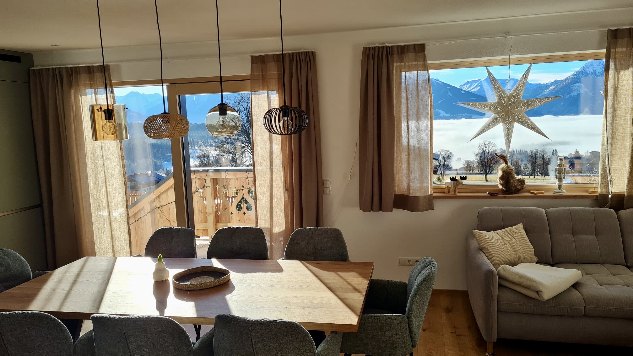 From the south-facing rooms, you can enjoy beautiful views of the surrounding mountains. On chilly winter days, the wood-burning stove in the living room provides a cozy warmth and an authentic alpine cabin atmosphere.